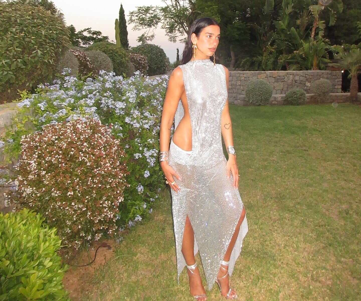 Dua Lipa poses braless in a see-through silver dress, flauntin’ her slender figure and some sideboob.