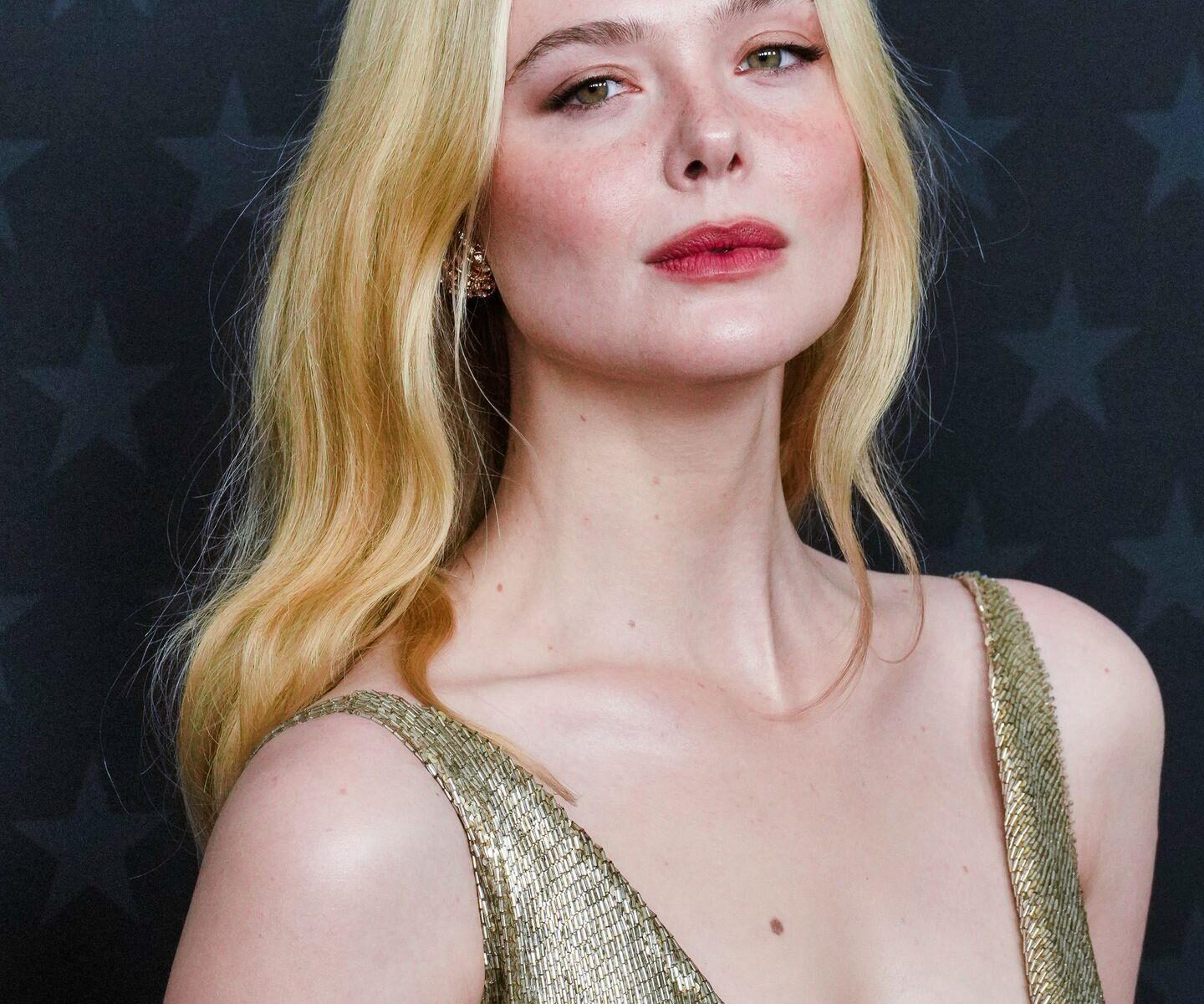 Elle Fanning is pictured braless in the Ralph Lauren gown while walkin’ on the red carpet at the 31st Annual Critics Choice Awards held at the The Barker Hangar in Santa Monica.