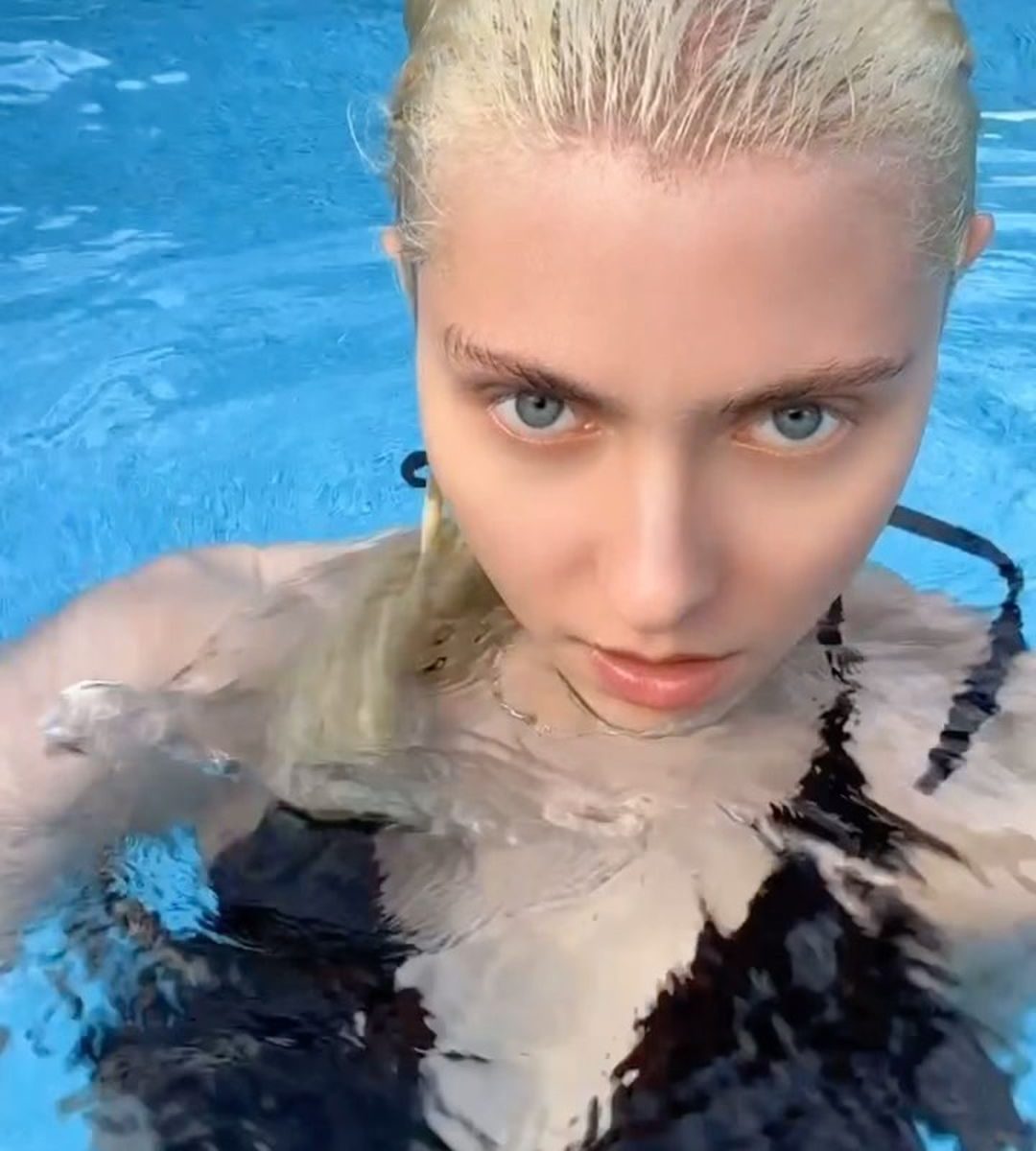 As for Taylor Momsen, her small tits are also showing off some nice cleavage, with her tits and tight model body closeup in that sexy black bikini by the pool.